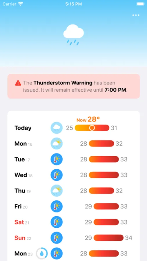 Four Seasons is a weather app that immerses you in the atmosphere of the weather as soon as you open it. Without even looking at the numbers, you can easily see the weather conditions for the present and the upcoming week. Icons and background colors show which days are sunny, while circular progress bars display the probability of precipitation, letting you know which days are more likely to require an umbrella. The Rainbow Temperature Bar allows you to feel the changes in temperature. The arrangement of information emphasizes trends and contrasts, without overwhelming you with unnecessary details.