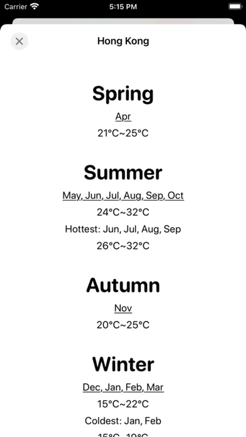 Hong Kong: Weather data is sourced from the Hong Kong Observatory and is the first to offer a unique redefined division of spring, summer, autumn, and winter months in this app. It allows you to view the number of days that have passed in the current season and a countdown to the next season.
