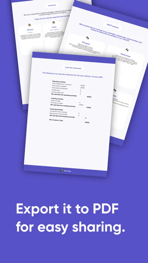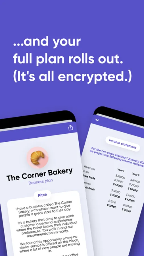 Answer questions about your business, and your fully customized business plan rolls out. Everything is encrypted, so we cannot go in and read your answers.
