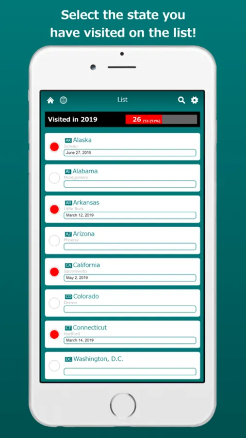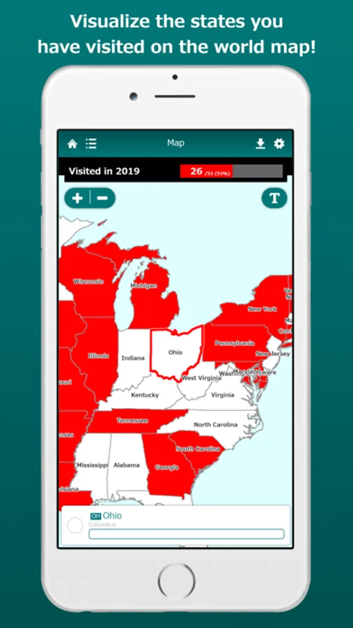 This app shows the states you have visited on the U.S. map! By displaying the labels, you can easily locate states on the map. The map can be zoomed in and out.