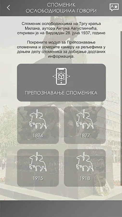 After recognizing the reliefs on the monument by using the Augmented Reality (AR) module in the application, the information on historical events and struggle for liberation of Niš in 1874, 1877, 1915, and 1918 is projected as text, audio, and photos.