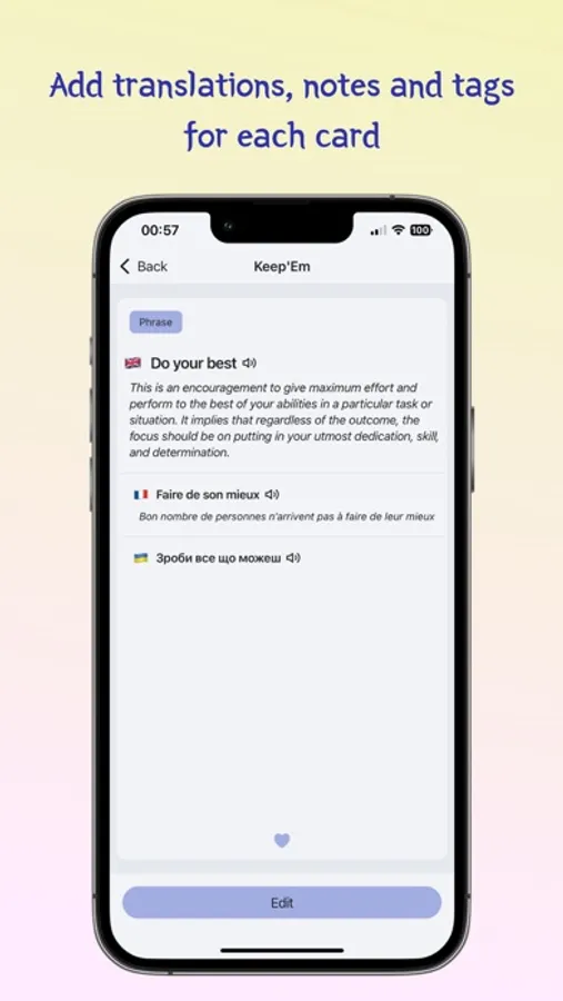 Customisation is your superpower. Add translations, explanations, and examples to each entry. Your vocabulary is as unique as you are, and our app empowers you to shape it exactly how you want, creating a versatile vocabulary tailored to your needs.