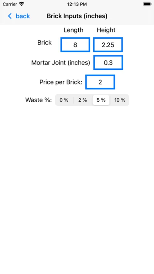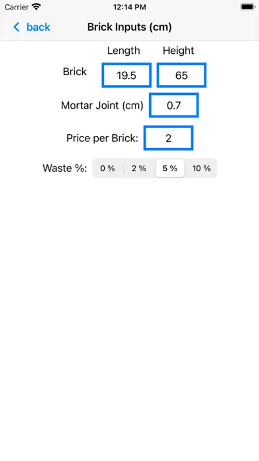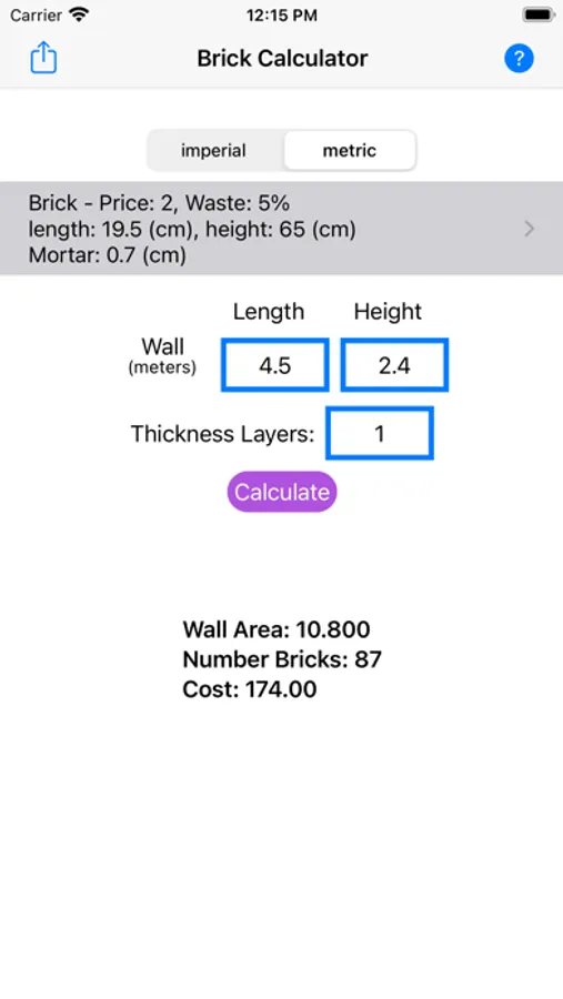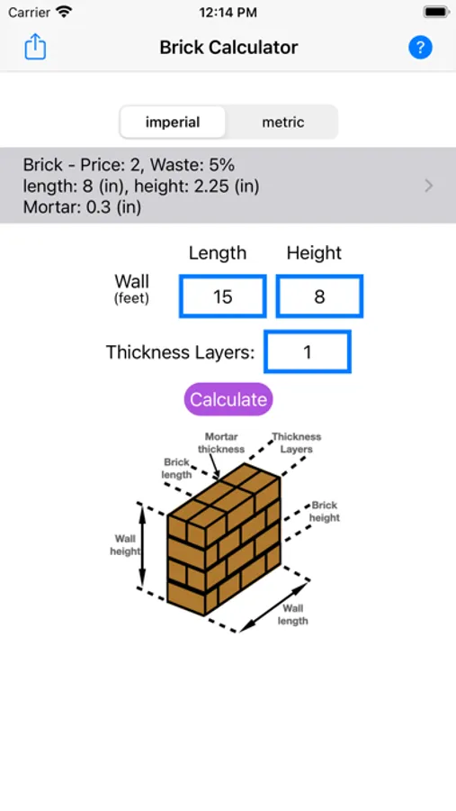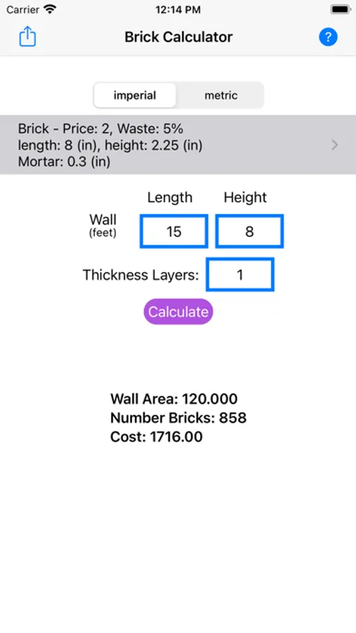Based on the area of the wall (pathway, patio, etc) and the brick size the App quickly calculates how many bricks are required.