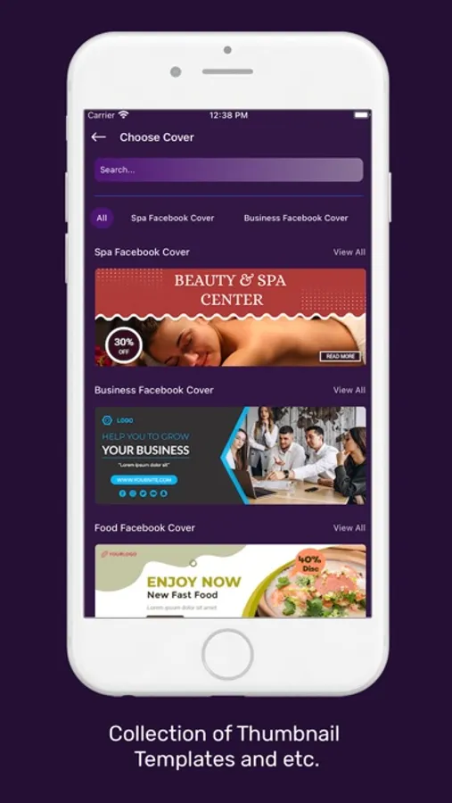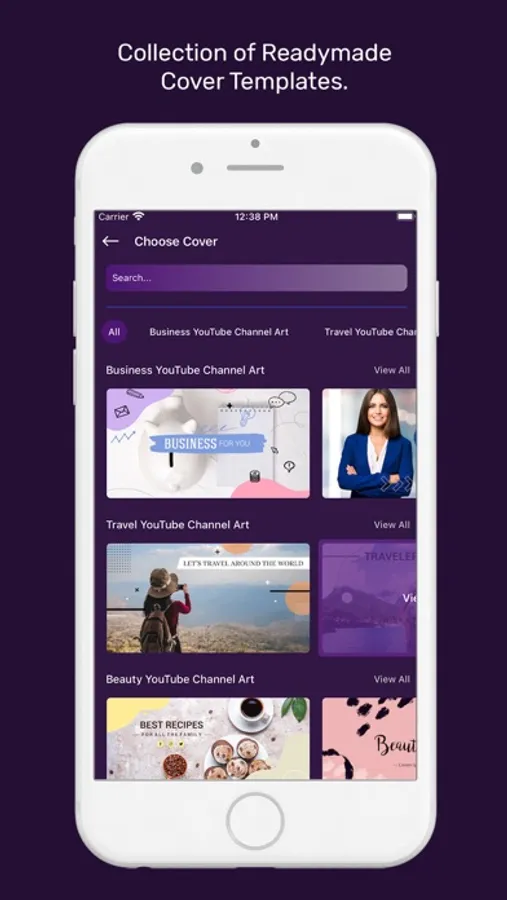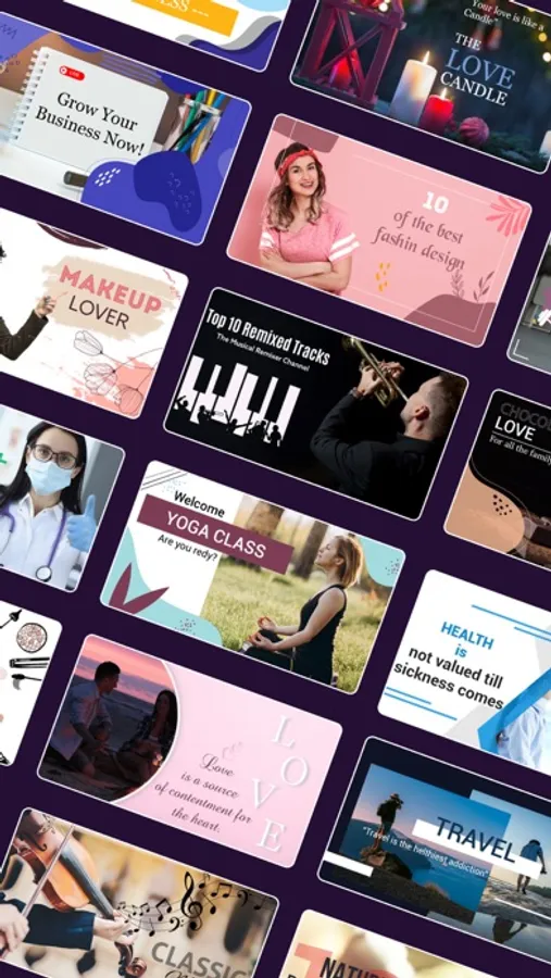 Thumbnail Design Maker App provides the collection of readymade templates like Business, Travel, Beauty, Fashion, Music, Food, Fitness etc.