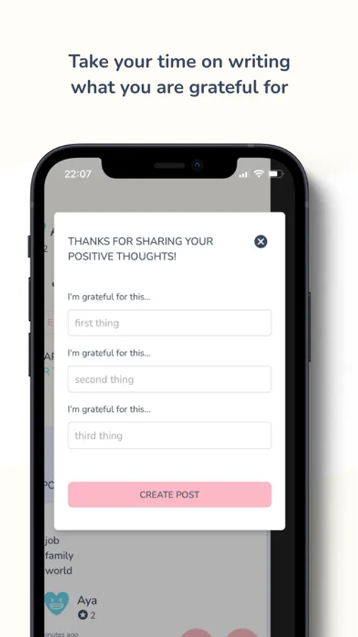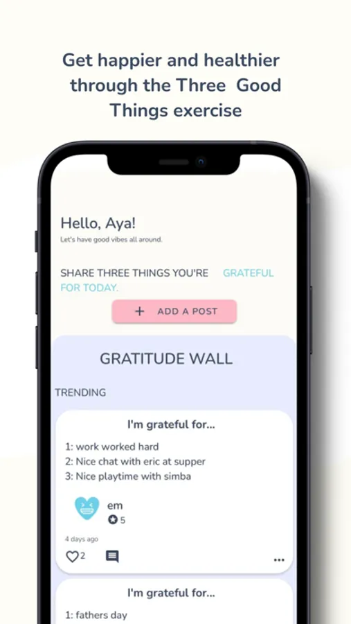 Share 3 things you are grateful for every day and spread the positive vibe throughout the app. It's a fun social platform were everyone shares uplifting quotes of their own. You can comment and like other's self-affirmations and get appreciated for your positive quotes. It's a friendly platform for getting daily motivation and thinking positive.