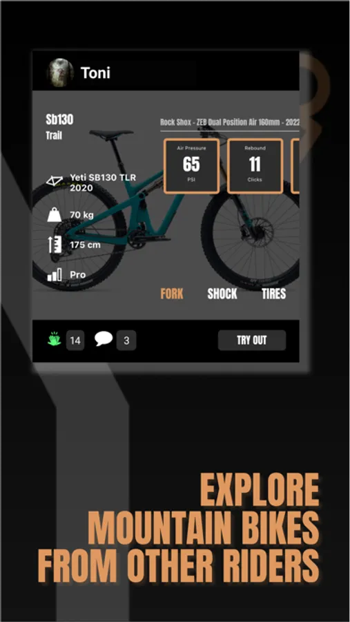 Explore setups from other riders in the MTB suspension app SAGLY. Filter and Search by frame, fork, shock or tire-models. Sort by number of high-fives (likes), number of comments, and recently created. The setups of other riders are displayed with all information about the rider and the bikes the setup is created for.