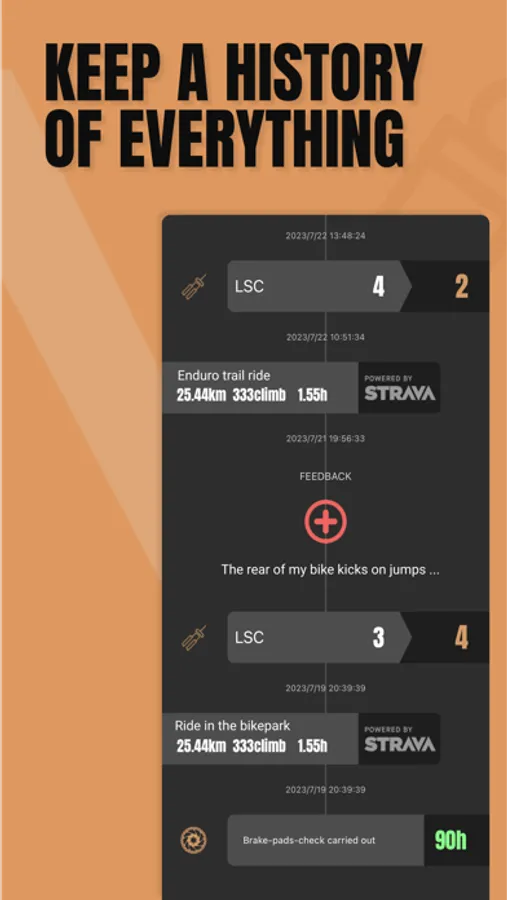 You can connect SAGLY to Strava and set up maintenance intervals. Based on your riding hours or mileage in Strava you will get notified in SAGLY to execute a maintenance. Always have an overview of the progress of your maintenances and keep track of them in the HISTORY feature.