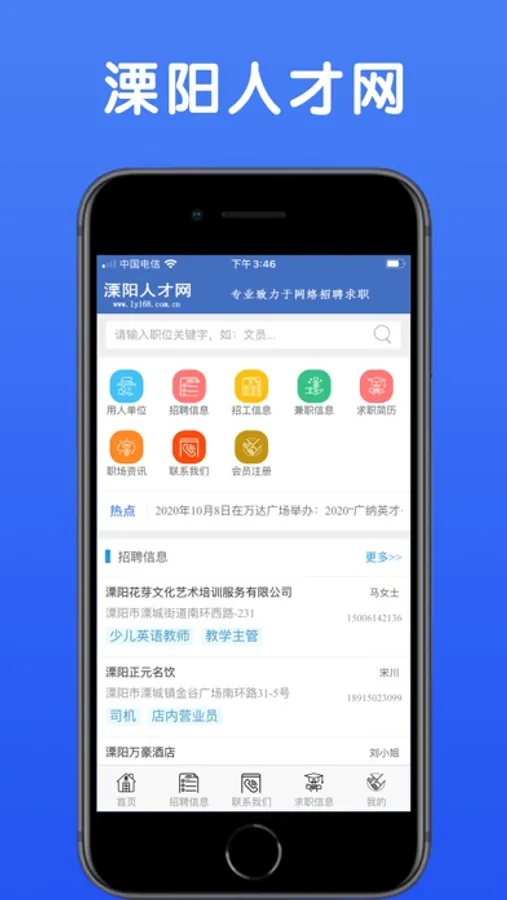 溧阳人才网APP(www.ly168.com.cn)作为专业的溧阳人才招聘平台,提供溧阳新招聘信息、溧阳招工信息、溧阳兼职信息、溧阳求职简历,溧阳招聘网让溧阳求职者找到满意工作、溧阳招聘单位找到满意人才。