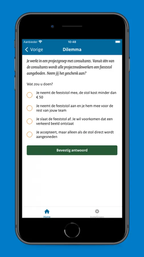 Daarnaast krijg je elke week een dilemma te zien in de app. Je kunt daar op stemmen, jouw antwoord vergelijken met andere ambtenaren en meer informatie vinden over het dilemma en het onderwerp.