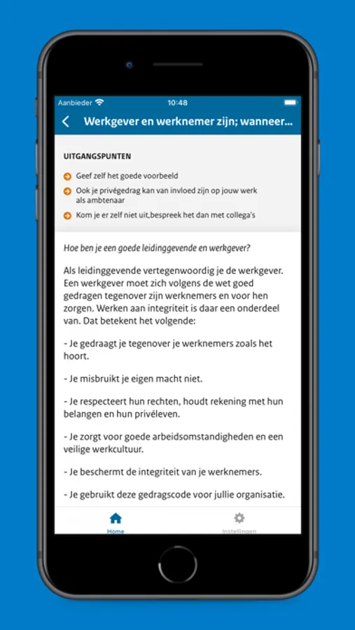 In de app kun je de tekst van de volledige gedragscode terugvinden. Je kunt vinden wat je zoekt door een categorie te kiezen die past bij jouw vraag. Ook kun je makkelijk zoeken op een trefwoord. Wat moet je bijvoorbeeld doen met geschenken? Welke vragen kun je jezelf stellen bij nevenwerkzaamheden? Bij wie kun je terecht als je ongewenst gedrag merkt? Hoe zit het met geheimhouding? En hoe begin je een goed gesprek over integriteit?