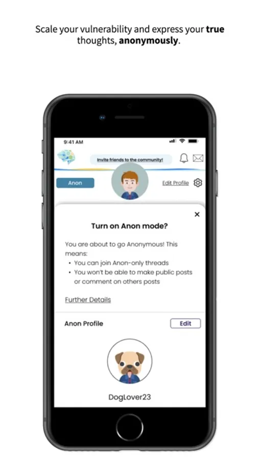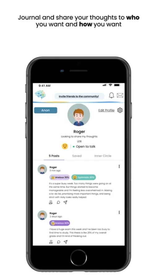 Anonymous Mode: Scalable vulnerability. That’s the main focus of our app. Share what you want. when you want, and how you want. Express your true thoughts, anonymously. This feature allows users to switch to an unidentifiable avatar where they can journal without being judged or burdening anyone else.