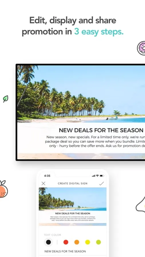 Make, share, and display digital signs in 3 easy steps: (1) pick a template, (2) customize it, (3) display it with Chromecast, webOS TV, or share on social media.