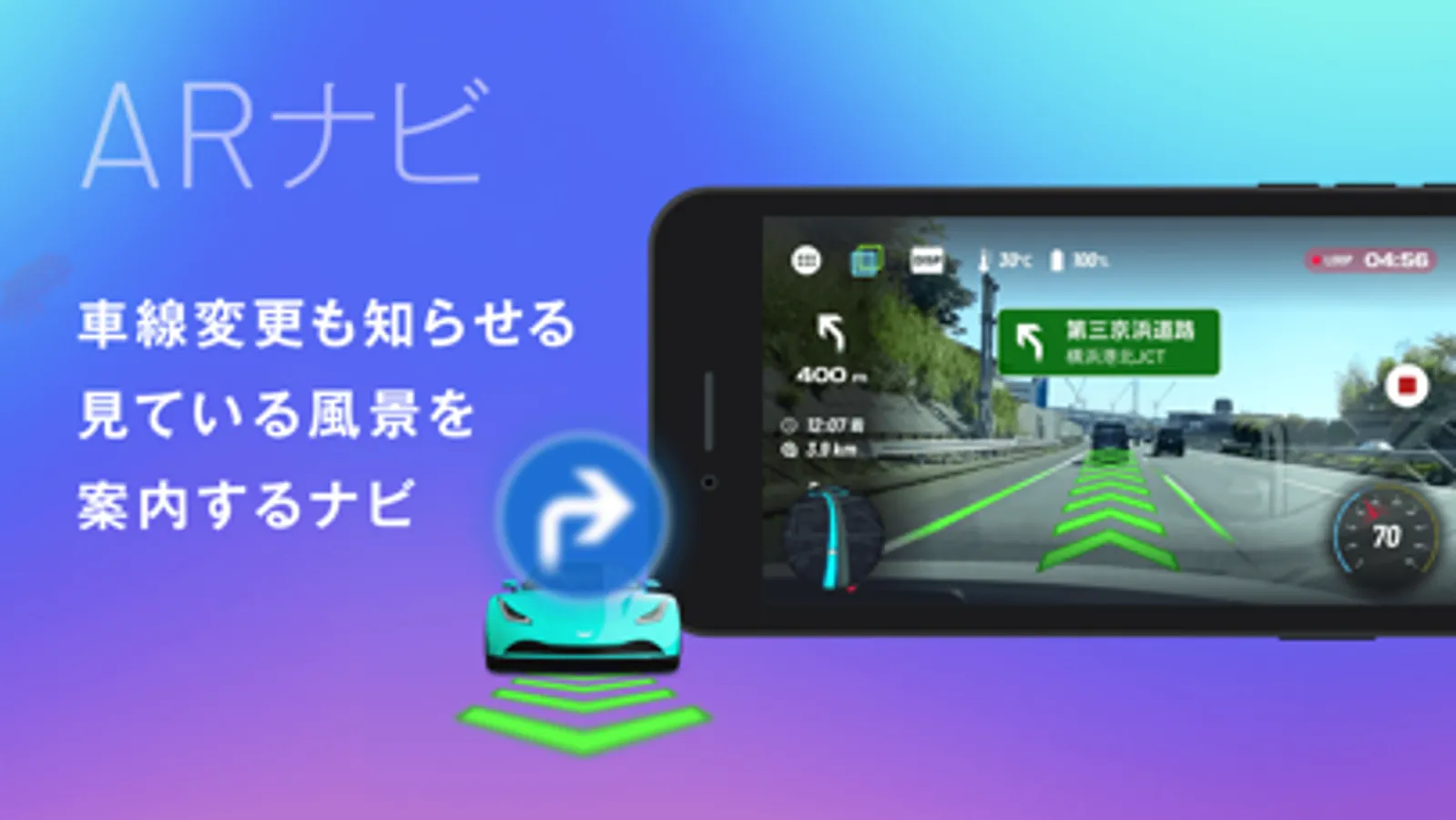 ドライブレコーダーで録画しているリアルタイムの道路映像上に、ARで目的地までのルートや方向を表示してナビゲーションします。