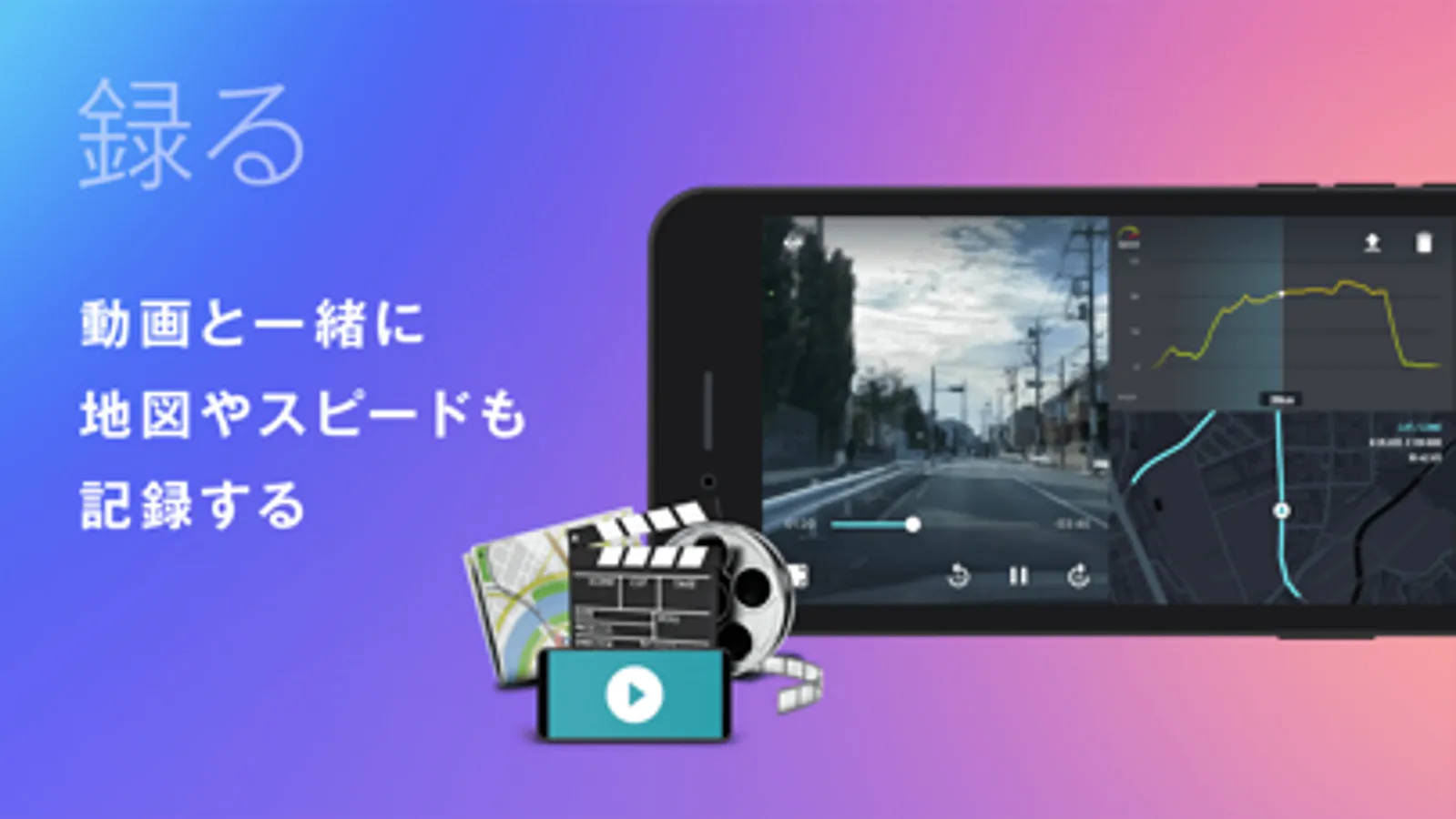 録画した走行時の映像は、地図や速度グラフと合わせて確認できます。「どこを」「どうやって」走ったのか、走行時の状況がよくわかります。