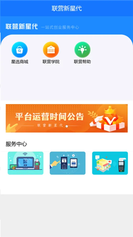 [联营新星代,创业好帮手]:联营新星代为创业者提供全方位一站式创业服务,包括设备购买,入网,交易查询,产品以及收入查询等功能,融合了多家机构产品及设备。