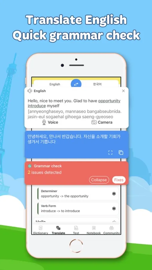 Check grammar errors right on an English Dictionary app: detect mistakes in words, English grammar, and detailed correction suggestions