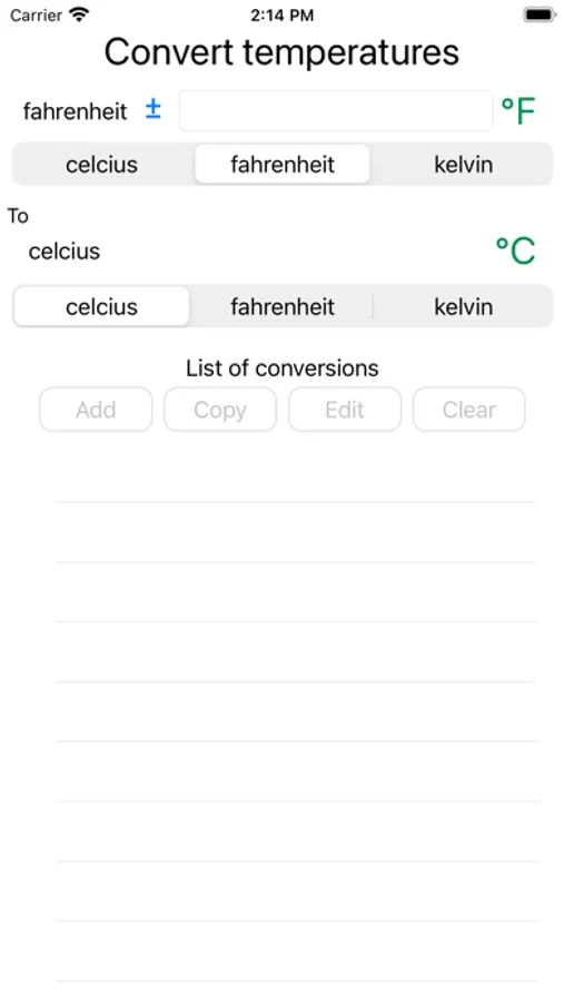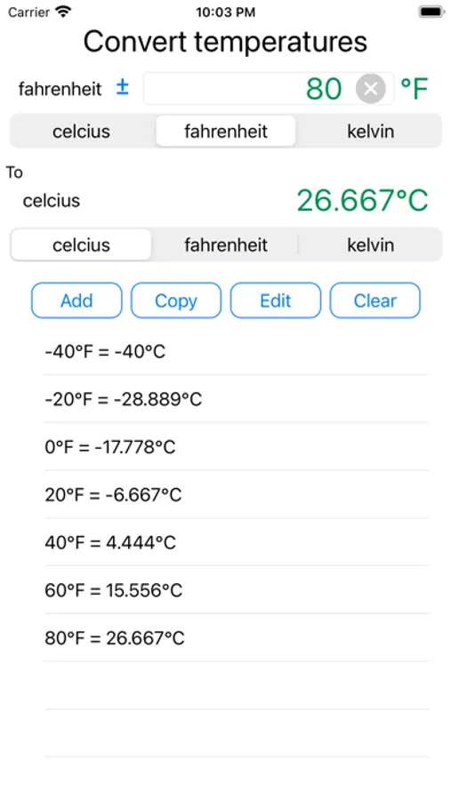 This app converts temperatures instantly between any of the 3 commonly used scales - Fahrenheit, celcius and kelvin. It allows the user to generate and edit a list of conversions and copy that list to the clipboard, from which the list can be pasted into other app, like Notes or emails.