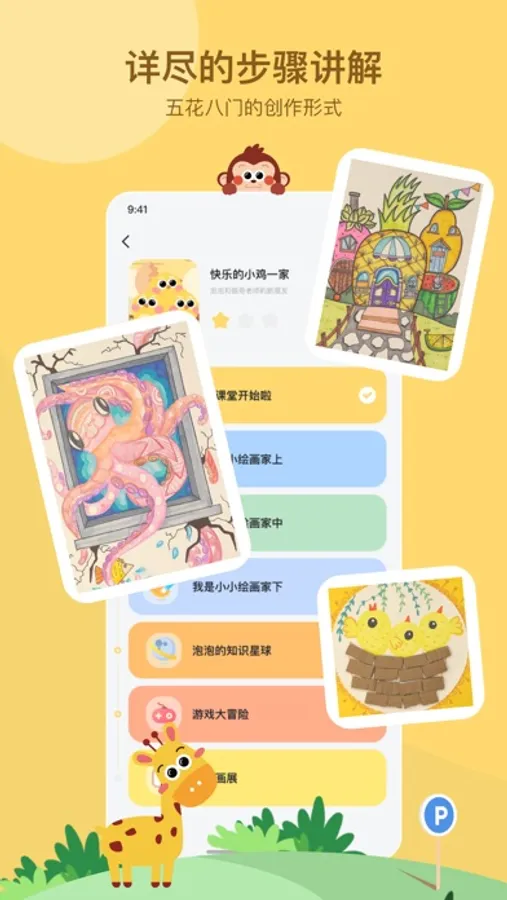 遵从孩子心理,创作孩子喜欢的故事,个性化衔接美术教学。用动画引入课程,让孩子在玩的过程中享受学习!小朋友们,准备好和小猴子泡泡一起学习画画了吗?