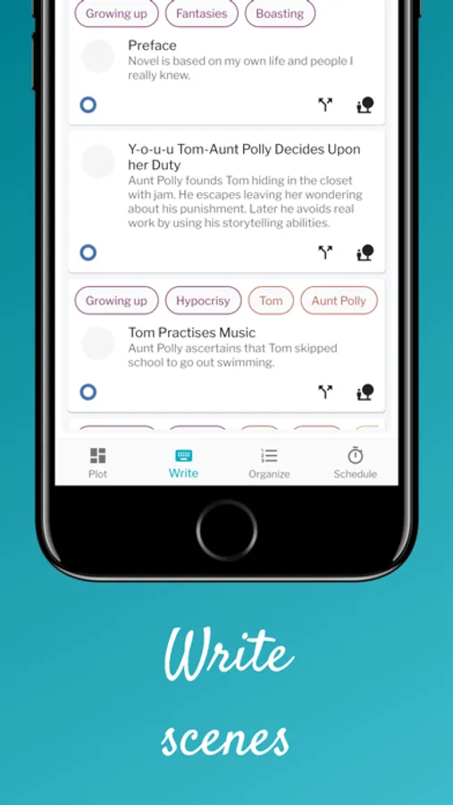 - Write - is when you put all the items together to compose scenes. Each scene is a piece of your story and can be annotated or written directly in our app!