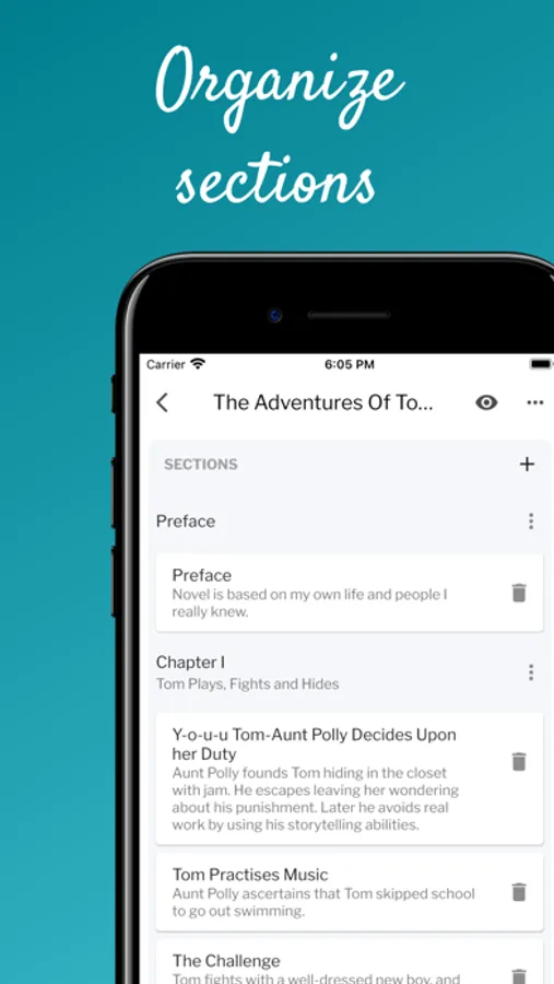 - Organize - is when you structure your scenes in acts, parts, chapters and so on. Your imagination is the limit.
