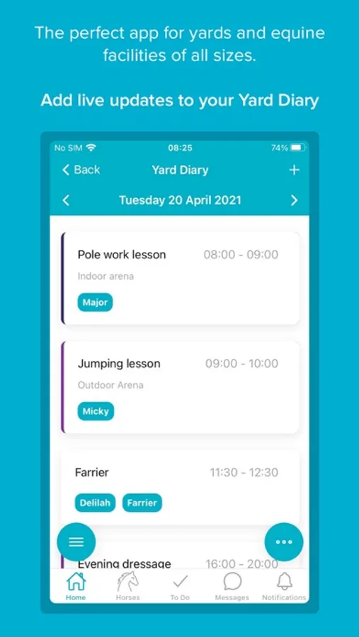 Diary: Use the yard diary to organise all of your events and bookings. Horse owners have 3 visibility options when adding to the diary: Only me, Me and Yard staff and Everyone.