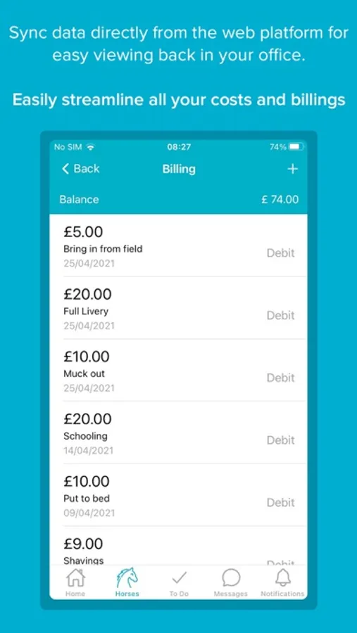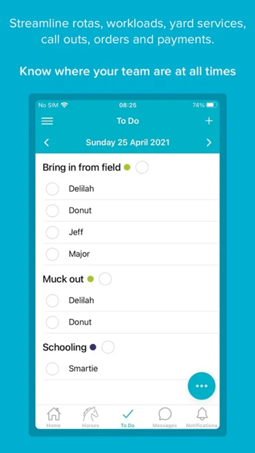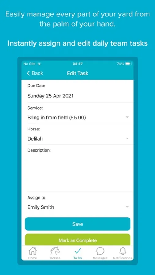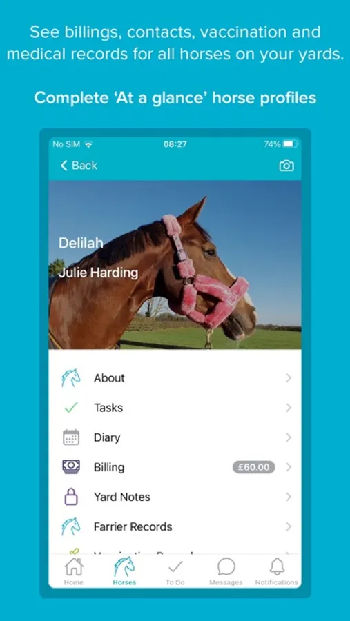 To do list: Organise your day at the yard. You can assign tasks to staff members, who will then ‘mark as complete’ when completed. If this is a billable service it automatically adds directly to the horses bill for that month.