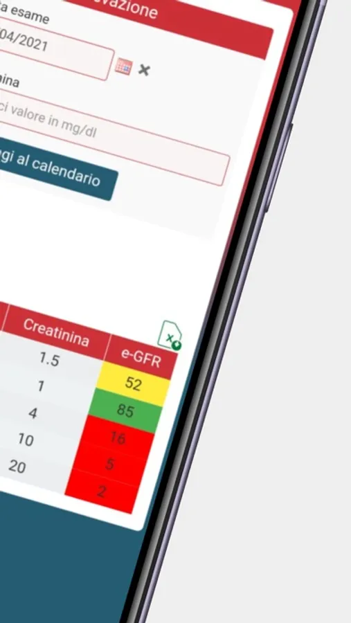 MONITORARE LA FUNZIONE RENALE: inserisci il valore della creatinina e la data dell’ultimo esame, l’app indicherà automaticamente il valore e-GFR. Scarica il file con le tue registrazioni e condividilo con il tuo nefrologo.