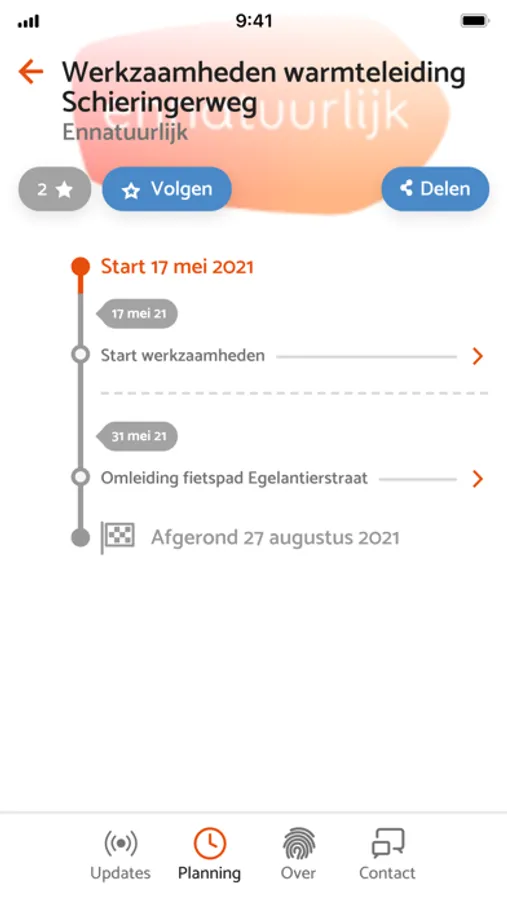 Het is mogelijk om pushnotificaties te ontvangen bij belangrijke mijlpalen en afsluitingen, je kunt vragen stellen of opmerkingen plaatsen en je kunt alle informatie uit de app delen.
