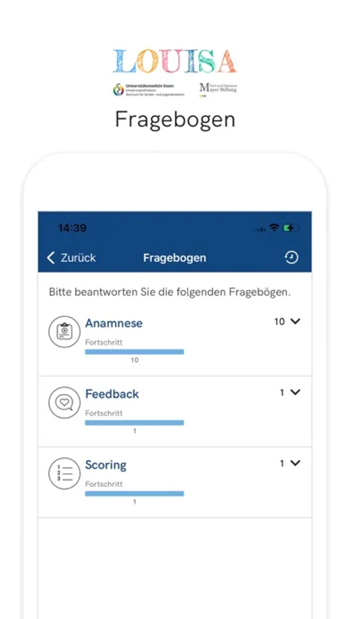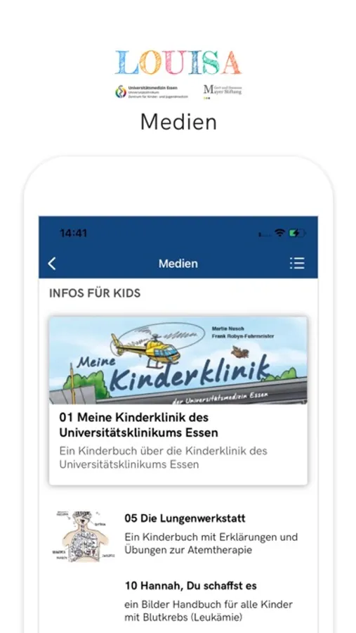 Die LOUISA-App begleitet Kinder und Jugendliche, sowie ihre Angehörigen vor, während und nach einem Klinikaufenthalt. LOUISA unterstützt euch durch kindgerechte Informationen und ermöglicht einen engen Austausch mit deinem Behandlungsteam im Zentrum für Kinder- & Jugendmedizin am Universitätsklinikum Essen.