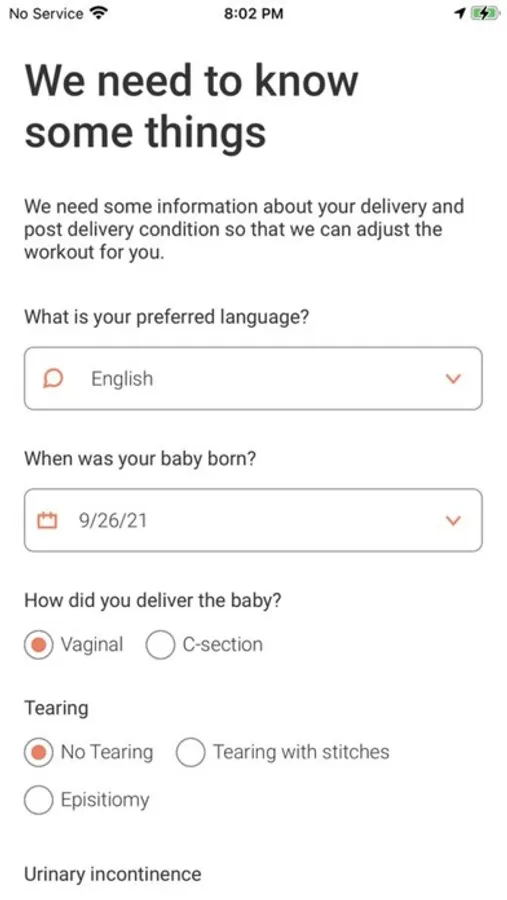Workout routine is tailored for different postpartum health conditions - vaginal or c-section delivery, tearing, diastasis size, and other. Enter your health data and application will calculate and present appropriate exercises for you.