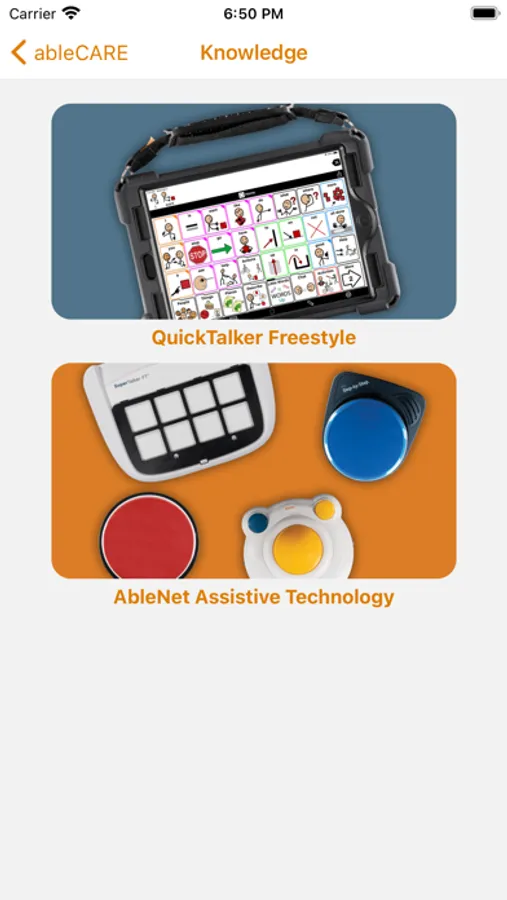 The ableCARE program provides support for AbleNet assistive technology and the QuickTalker Freestyle speech device. The ableCARE app provides access to the ableCARE Product Success team and knowledge base filled with videos and other resources.