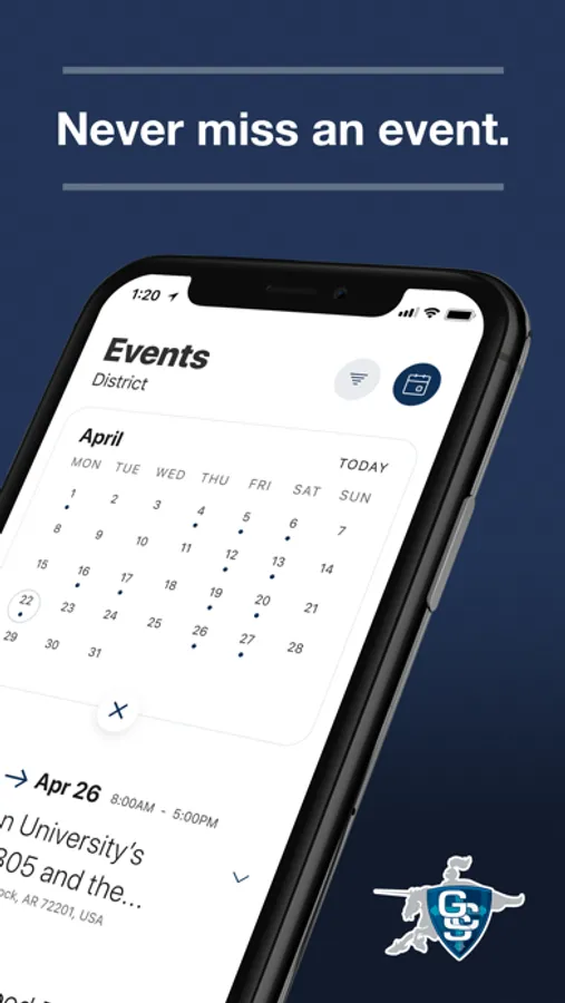 The event section shows a list of events throughout the district. Users can add an event to their calendar to share the event with friends and family with one tap.