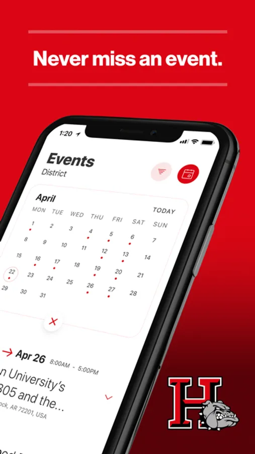 The event section shows a list of events throughout the district. Users can add an event to your calendar to share the event with friends and family with one tap.