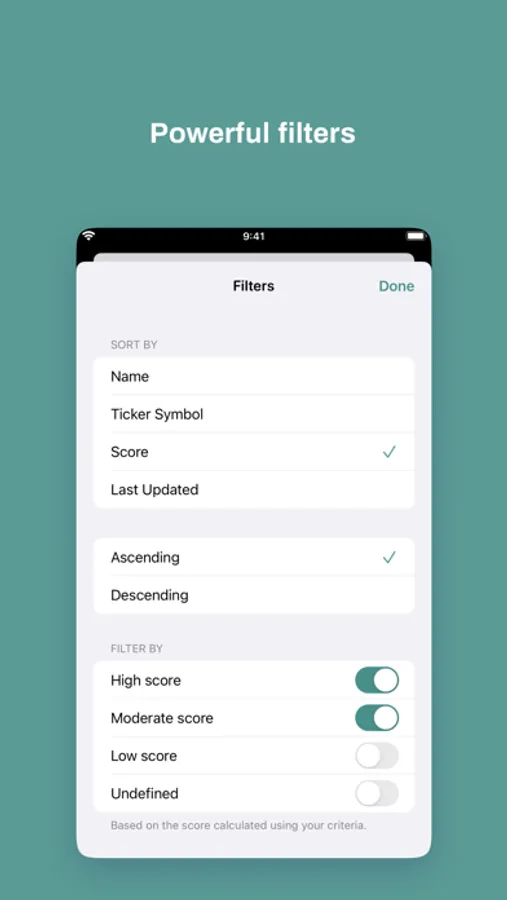Manage your portfolio and choose the best companies to invest with the help of SCO.re. It generates a score for each company based on your own list of criteria. Use it as a guide to your investment decisions.