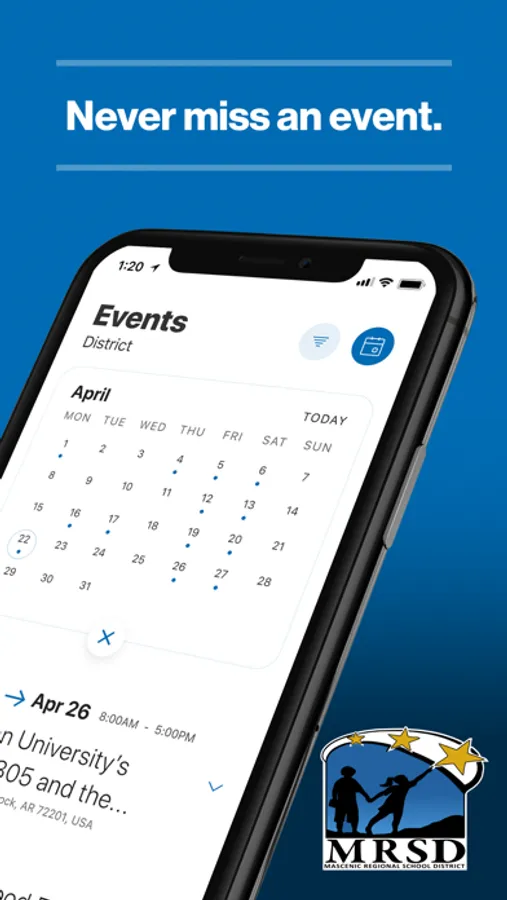 The event section shows a list of events throughout the district. Users can add an event to their calendar to share the event with friends and family with one tap.