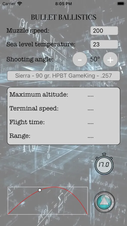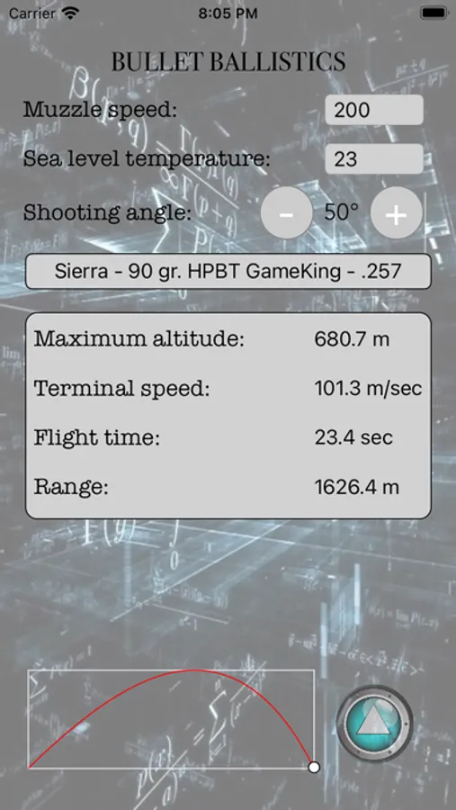 Realistic simulation of bullet ballistics accounting for atmosphere effects. Calculates range, maximum altitude, flight time and bullet return to ground speed.