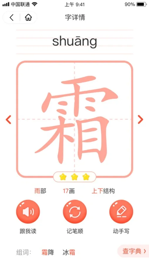 1、 字词认写:同步小学语文教材识字表、写字表、词语表,每个字均可以听发音,记笔顺,在线描红,快速识字;