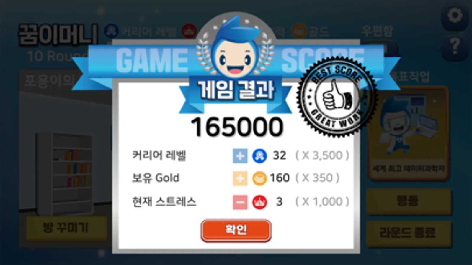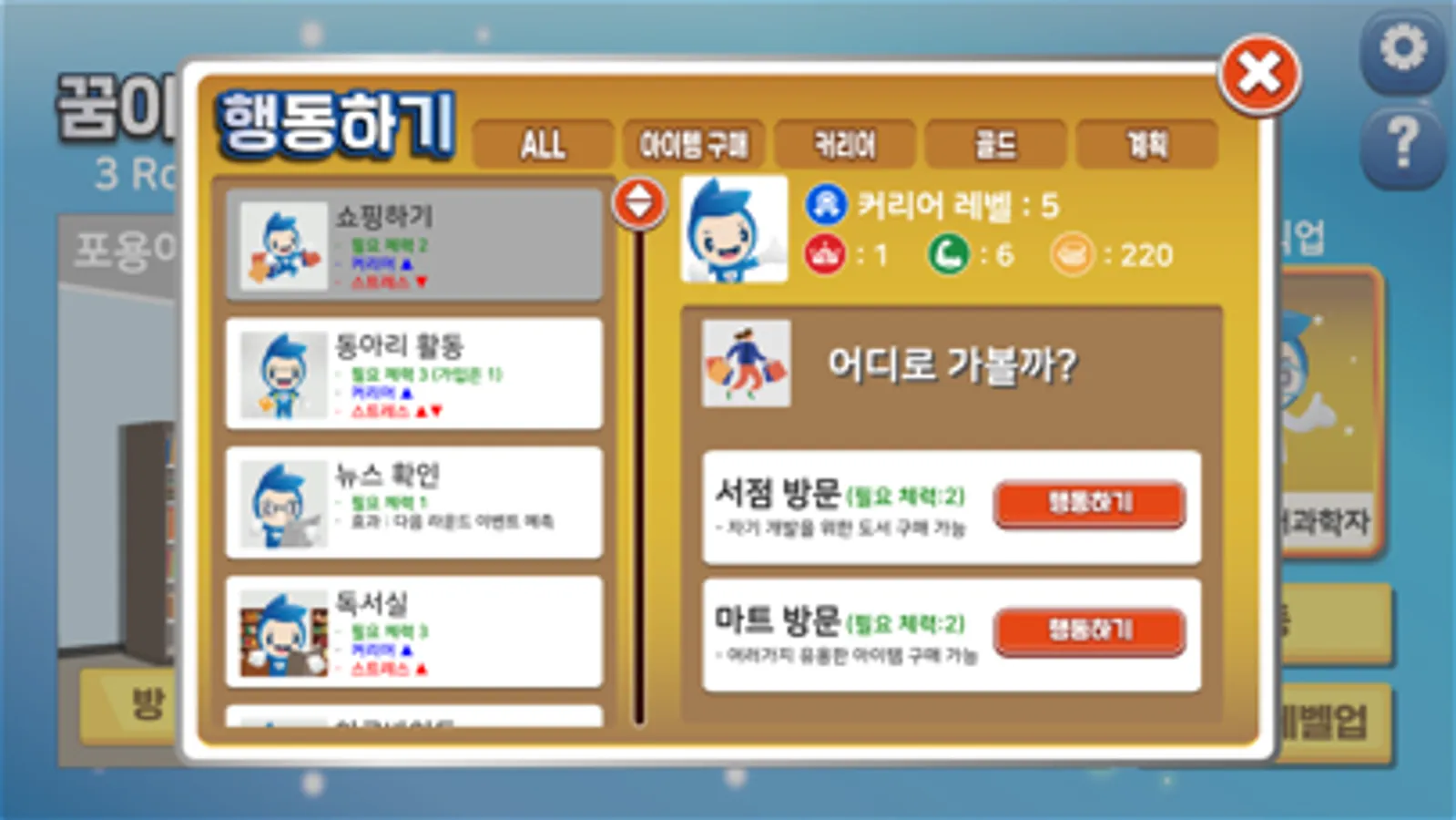 플레이어는 한정된 골드와 라운드 안에서 커리어를 쌓을지, 아르바이트를 할지, 지친 나를 위해 휴식을 취할지 매 라운드마다 신중하게 결정해야 해요! 열심히 하다 보면 커리어 레벨이 상승해요. 누구의 커리어가 더 높은지 경쟁해보세요!