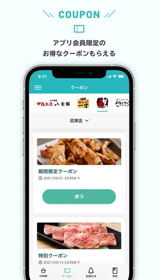 ゆうだいアプリでは、雄大グループ各店で使えるクーポンがもらえます。