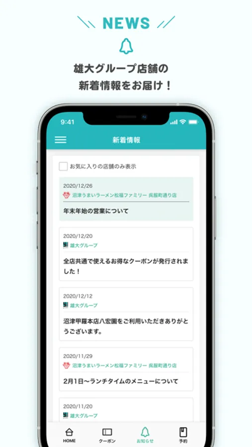 雄大グループからの大切なお知らせや、各店からのお得なキャンペーン情報をお届けします。