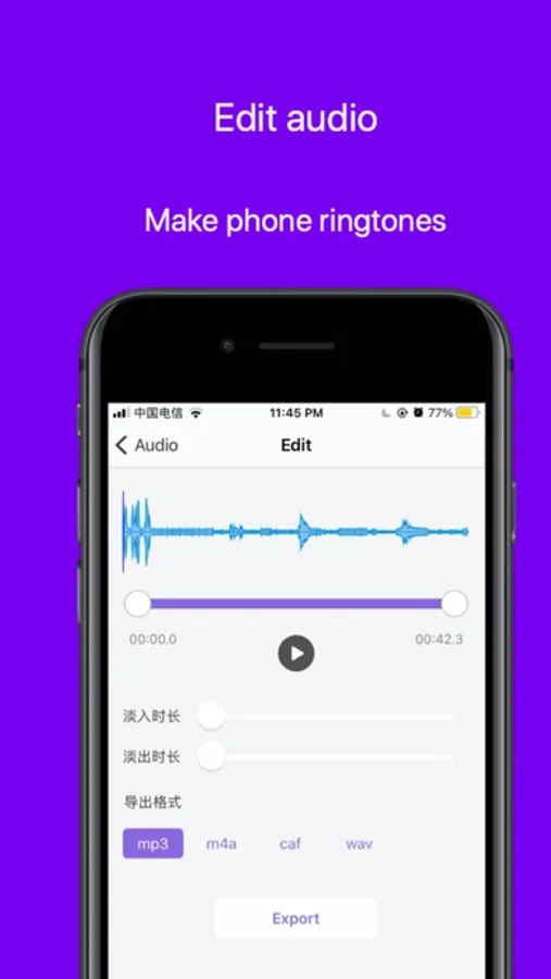 MP3 Editor allows you to extract audio from videos in various formats, and supports exporting to mp3, wav, caf, m4a and other formats. The converted audio will be saved to the phone or set as a ringtone