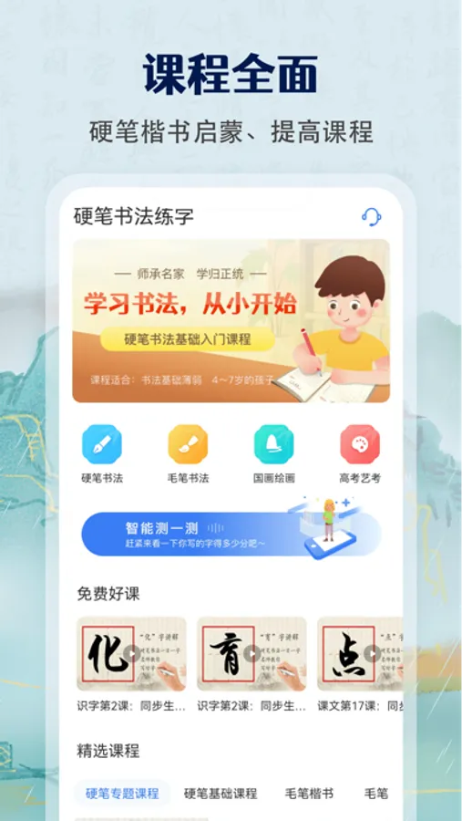 少儿、小学硬笔书法启蒙课程教学,结合AI智能学习系统对写字进行测评,并包含书法字帖、书法碑帖、书法字库和练字帖的写字练字软件