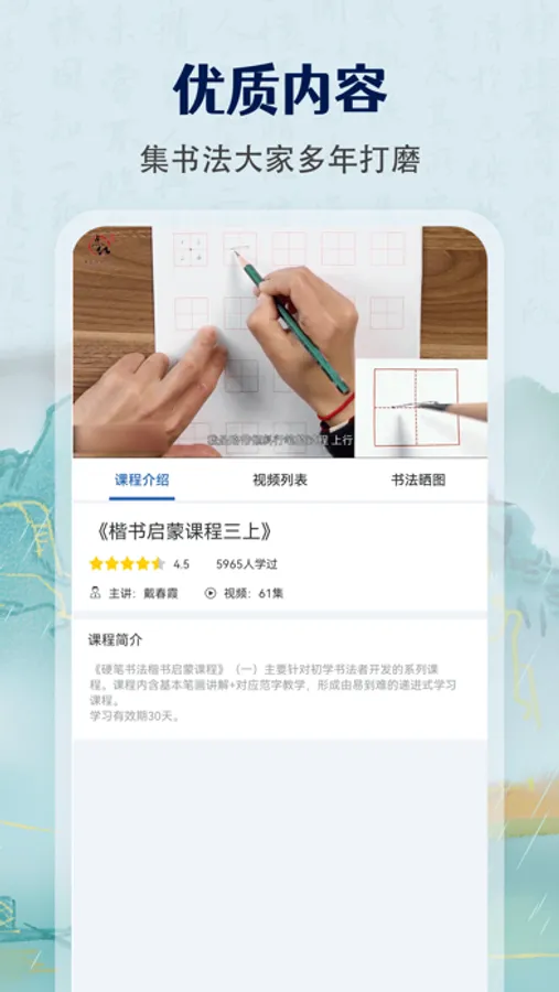 经典名师教学课程:“中国书法家协会”名师亲自传授书法教学课程,从一笔一画至力量美观,各阶段传授写字要领,满足各类人群对练字的需求。