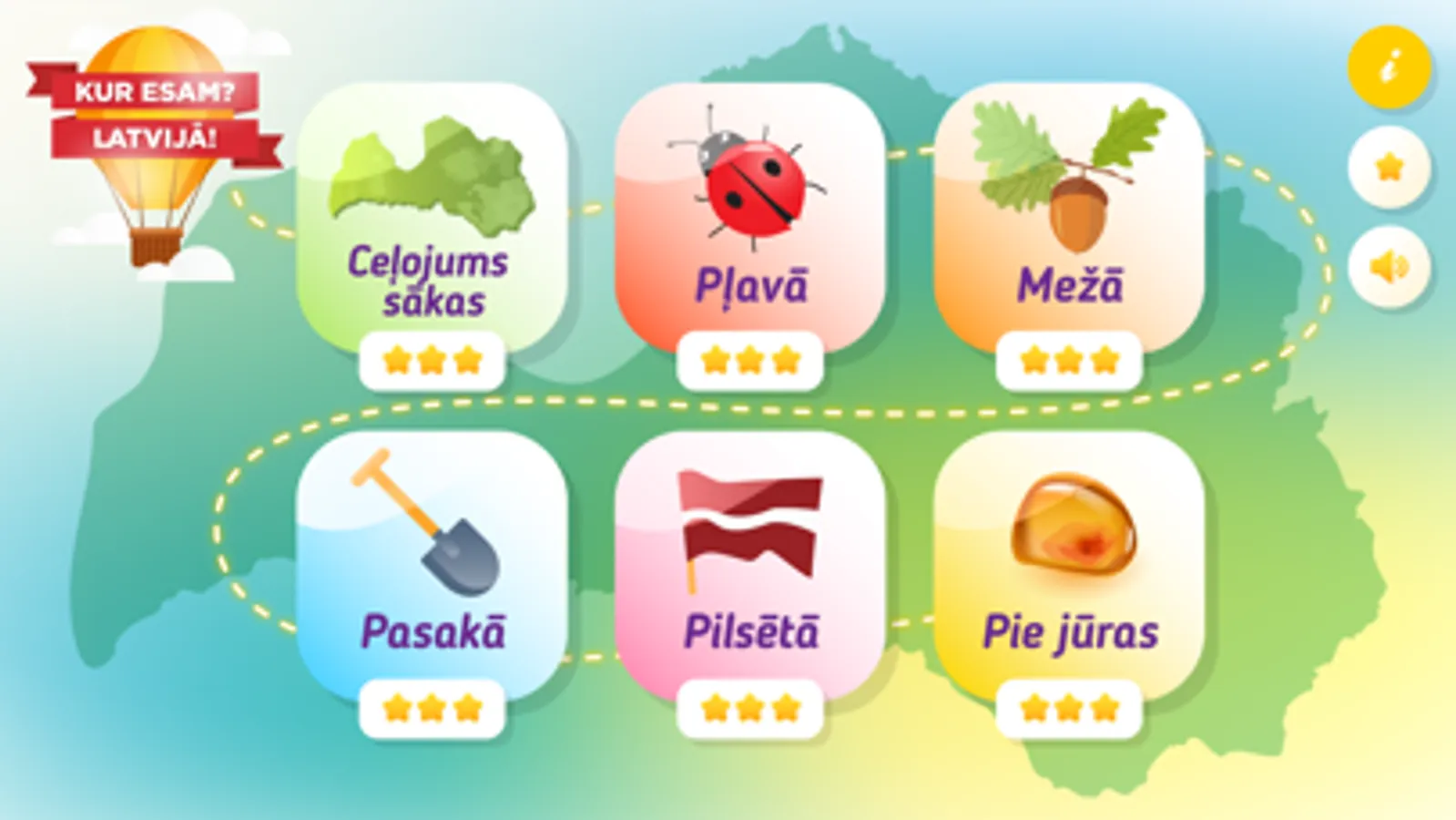 Lietotne pirmsskolas un sākumskolas vecuma bērniem "Kur esam? Latvijā!" paredzēta latviešu valodas apguvei, vārdu krājuma papildināšanai, Latvijas kultūras un dabas daudzveidības iepazīšanai un zināšanu nostiprināšanai ar tematiem atbilstošiem uzdevumiem.