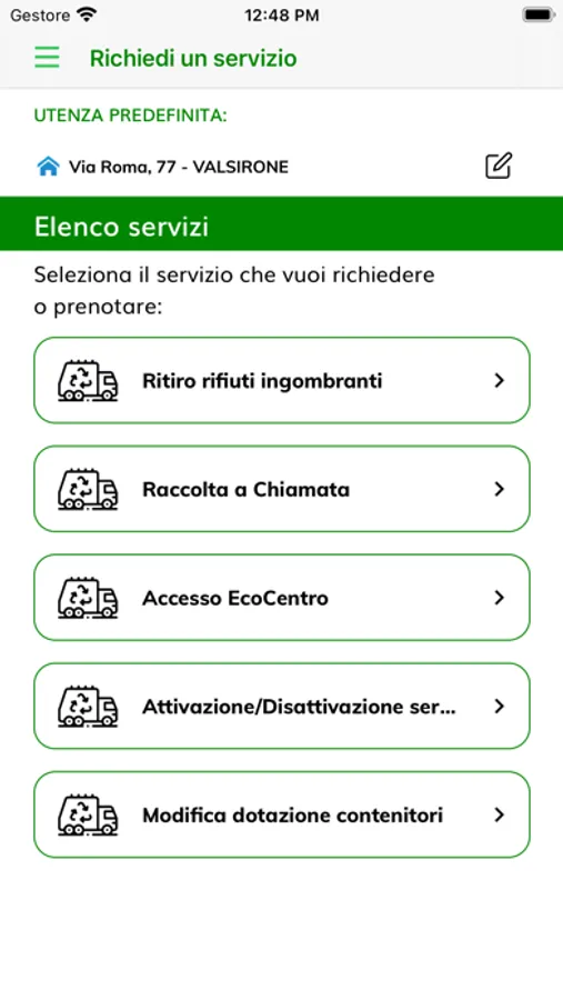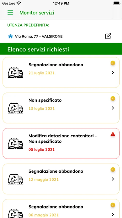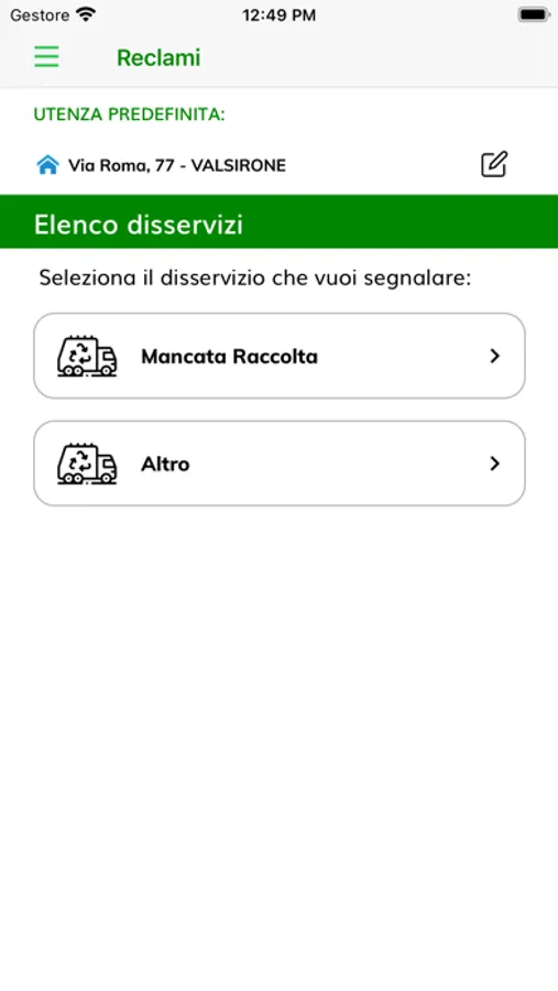 In questa sezione l’utente può effettuare una segnalazione relativa ad un disservizio, inviandola direttamente al Gestore. In base ai servizi attivi nel proprio Comune è possibile segnalare ad esempio: