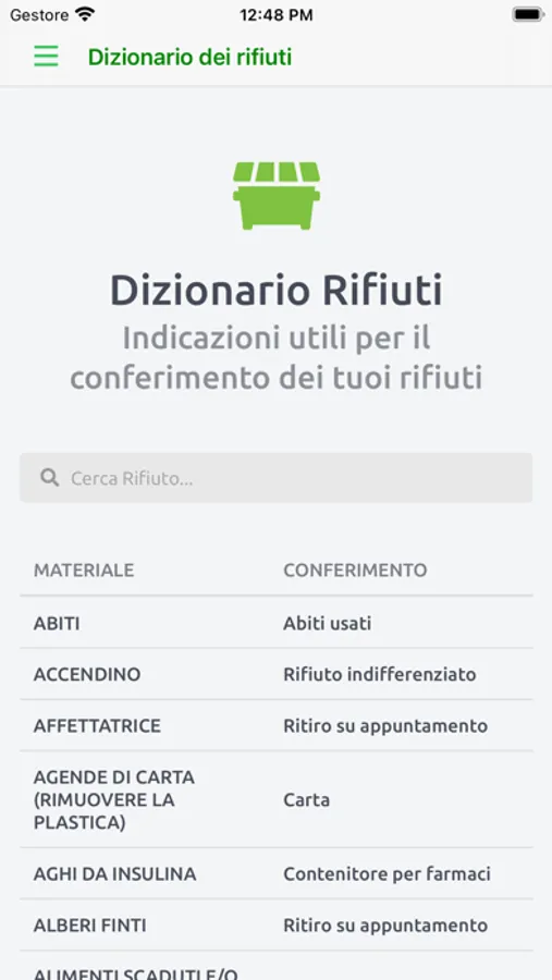 Il dizionario dei rifiuti contiene una lista della maggior parte degli oggetti che a fine utilizzo diventano “rifiuto”. Per ogni oggetto è indicato il tipo di materiale e il corretto conferimento nella Raccolta Differenziata