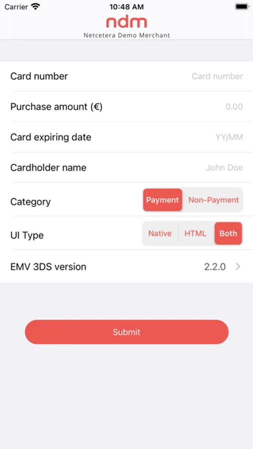 Netcetera Demo Merchant (NDM) is an application that integrates the Netcetera’s 3DS SDK product. The demo application provides an EMV 3DS authentication checkout experience with all required payment details, as a part of EMV 3DS authentication processing for Mastercard Issuing App Channel validation in production. Here, Issuers can register and use Netcetera's Acquiring services to initiate Application-based 3DS transactions, troubleshoot and fine-tune their setup. By doing this, issuers can improve the transaction processing in production environment and to decrease the abandonment rate.