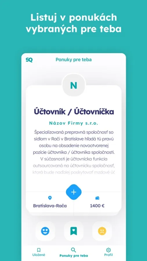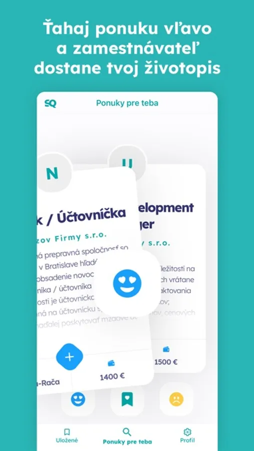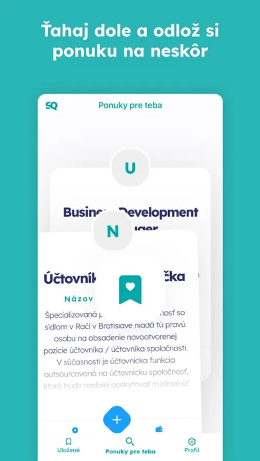 Ak si nie si istý, či sa Ti ponúkaná profesia hodí, odložíš si ponuku na neskôr tým, že posunieš kartu dole alebo stlačíš záložku so srdiečkom a môžeš sa k tejto ponuke vrátiť.