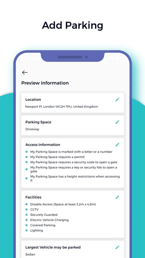 As a Parking User, you can rest assured that all of our parking spaces have undergone robust security checks, preventing scammers from creating fake parking ads. We have created a simple customised parking search process for your convenience. Our app allows you to narrow down your search using parking filters based on city, street, area, type of parking, vehicle size, availability, cost, date and time.