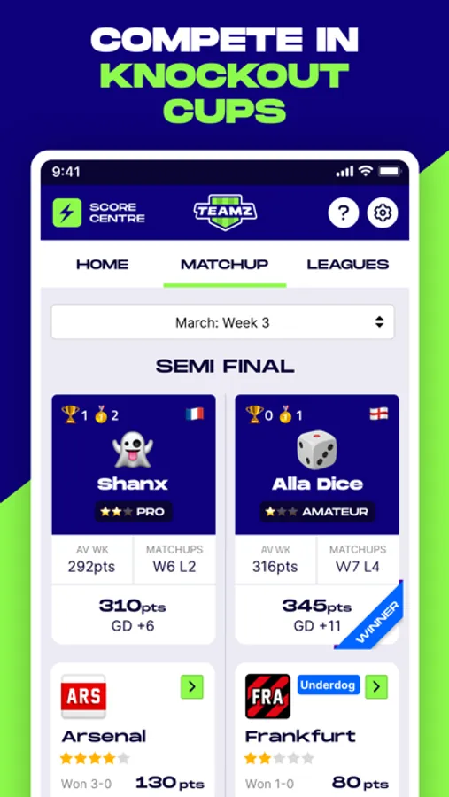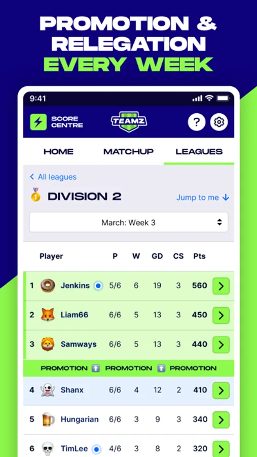 • Compete in 30-player capped leagues with promotion and relegation each week